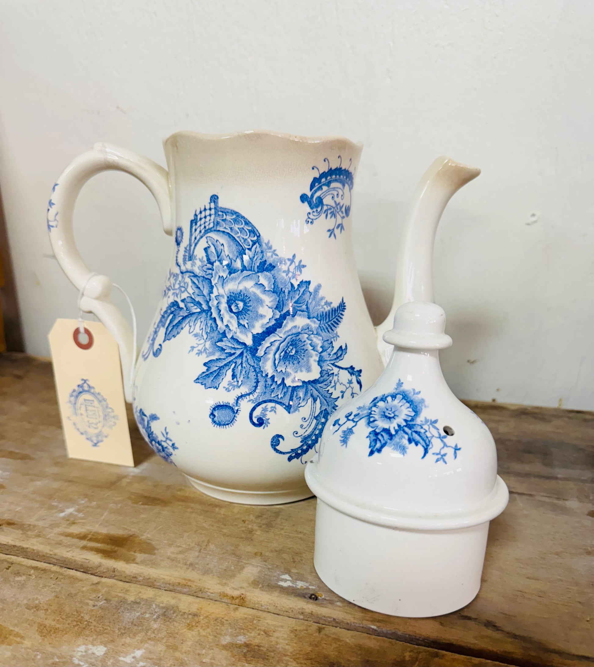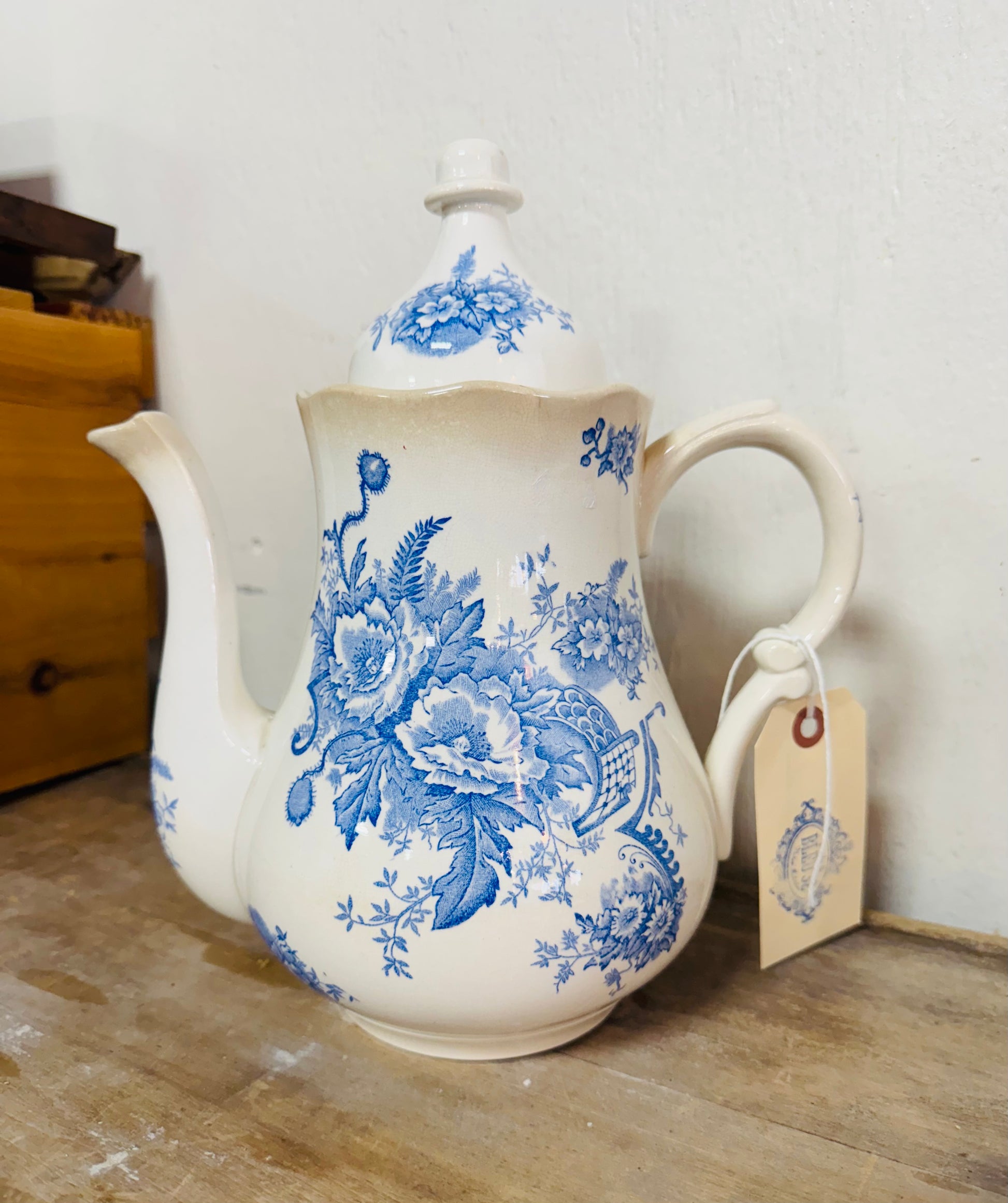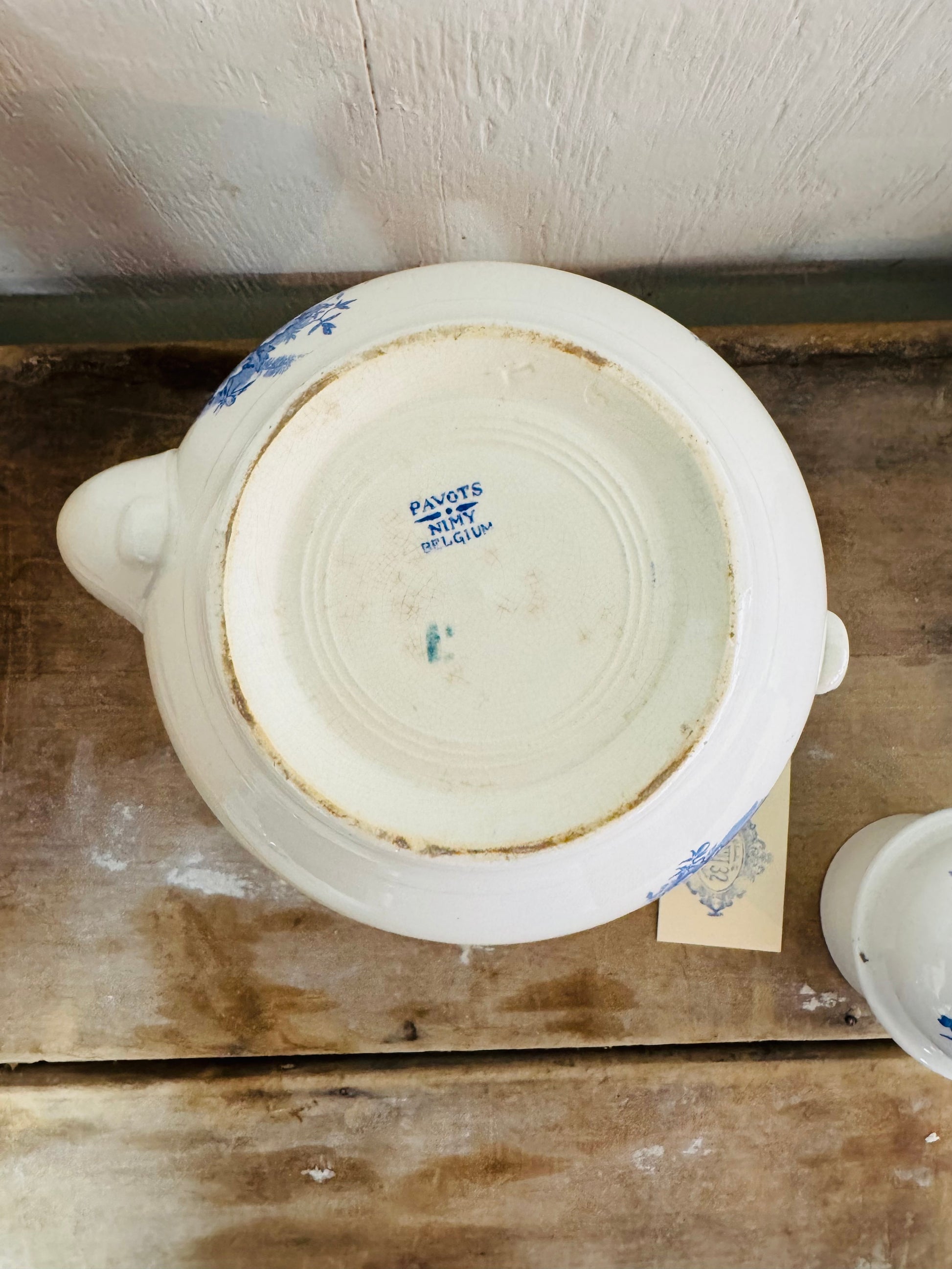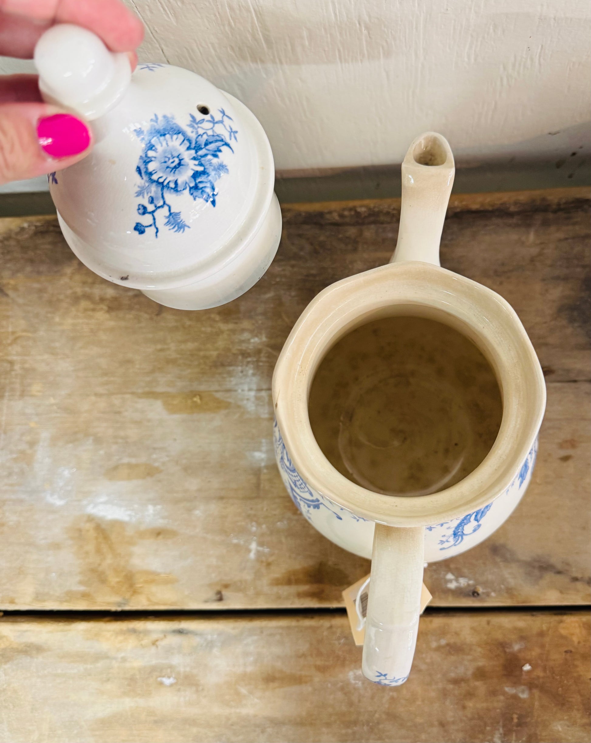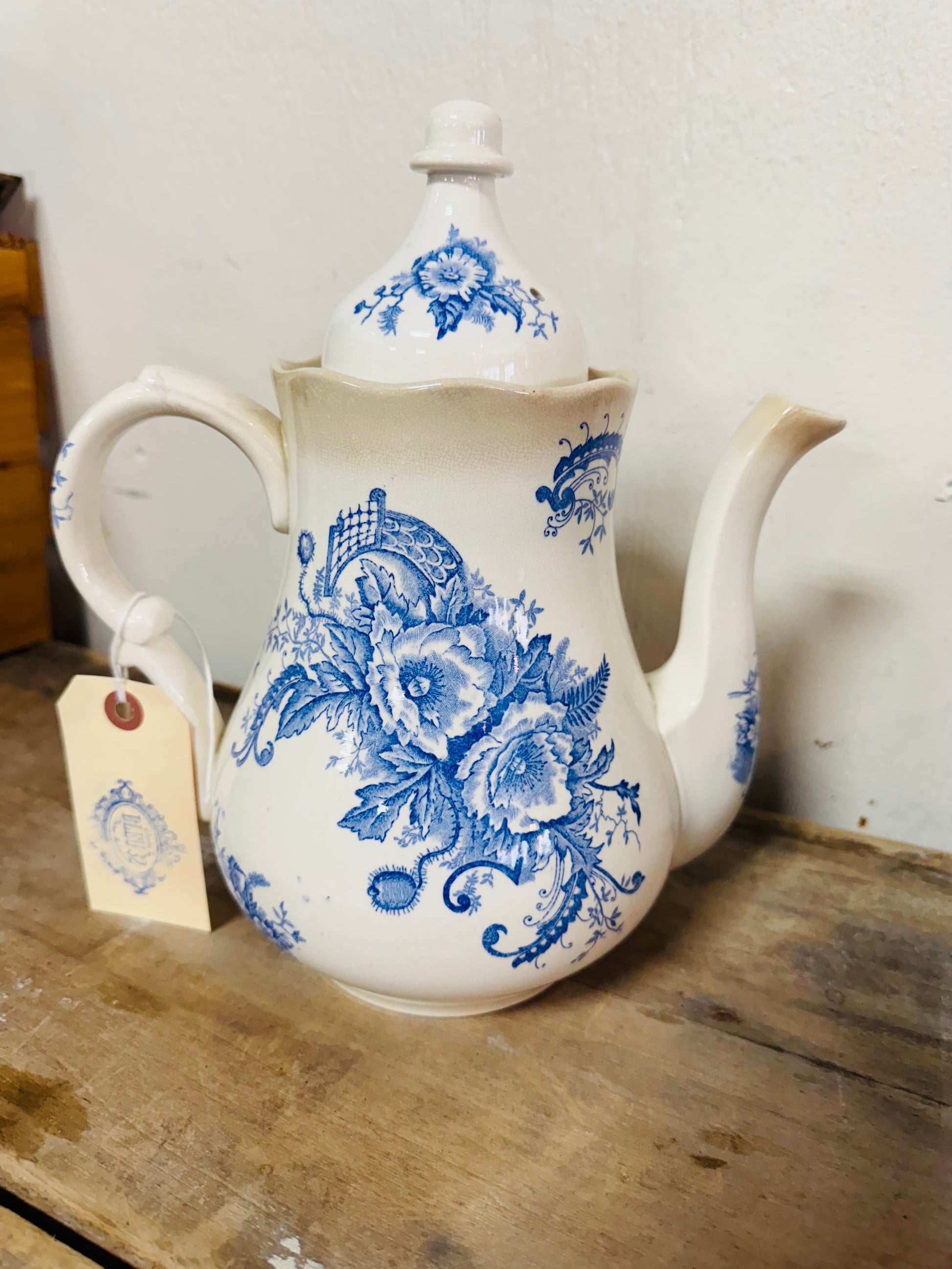 Marked “Pavots Nimy Belgium,” this stunning transferware teapot features delicate cobalt blue floral motifs and a sculpted lid with vent hole. The soft crazing and warm patina add to its vintage charm. A lovely collectible piece for display or light decorative use. (11 inches tall with lid)