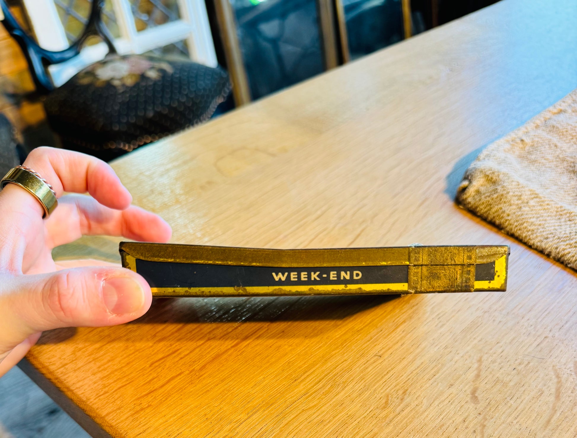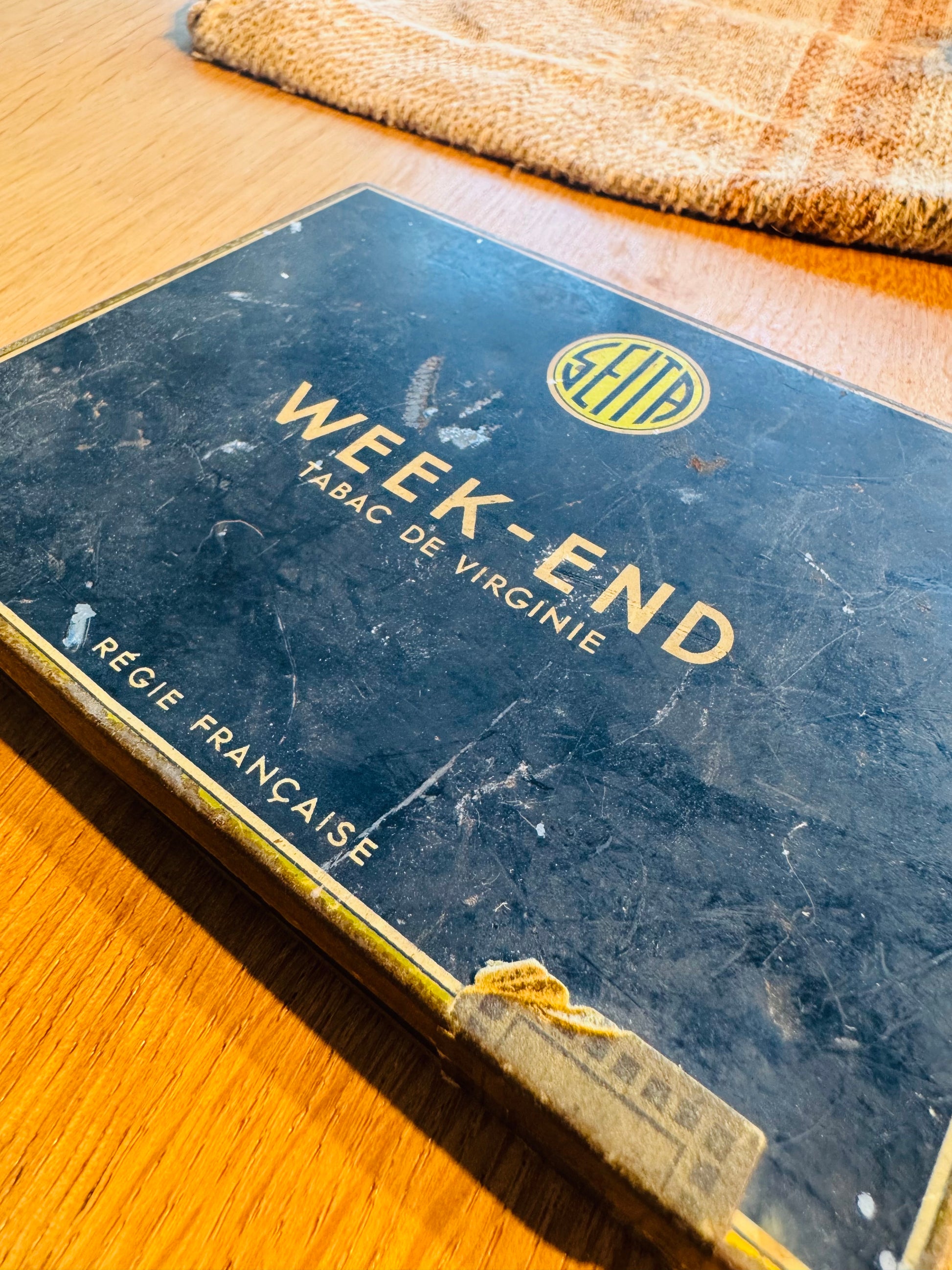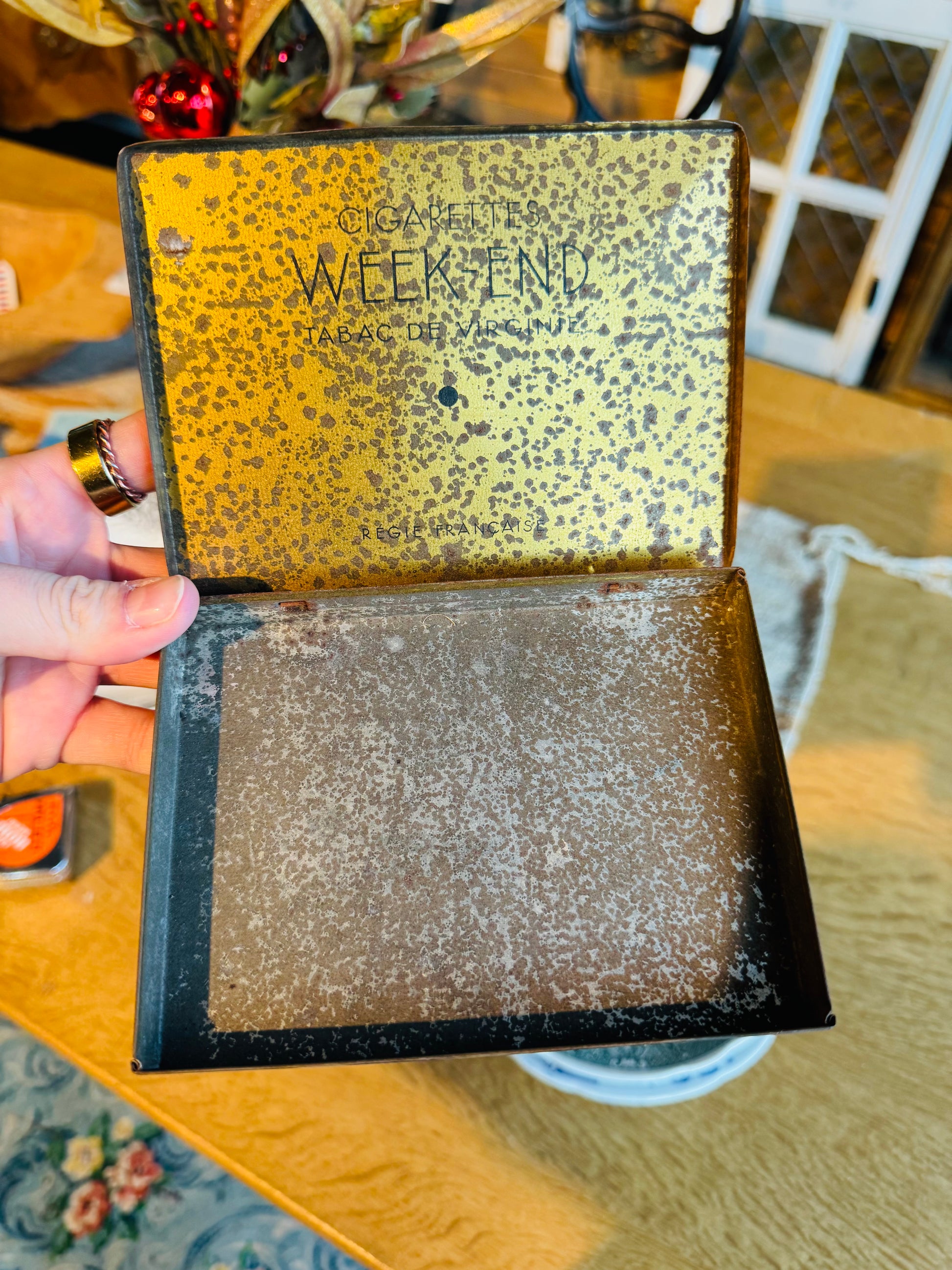 A striking antique French cigarette tin labeled “Week-End – Tabac de Virginie,” produced under the Régie Française (French state tobacco monopoly). This piece dates to the early–mid 20th century and features bold navy, gold, and black Art Deco graphics with beautiful, authentic age patina throughout.