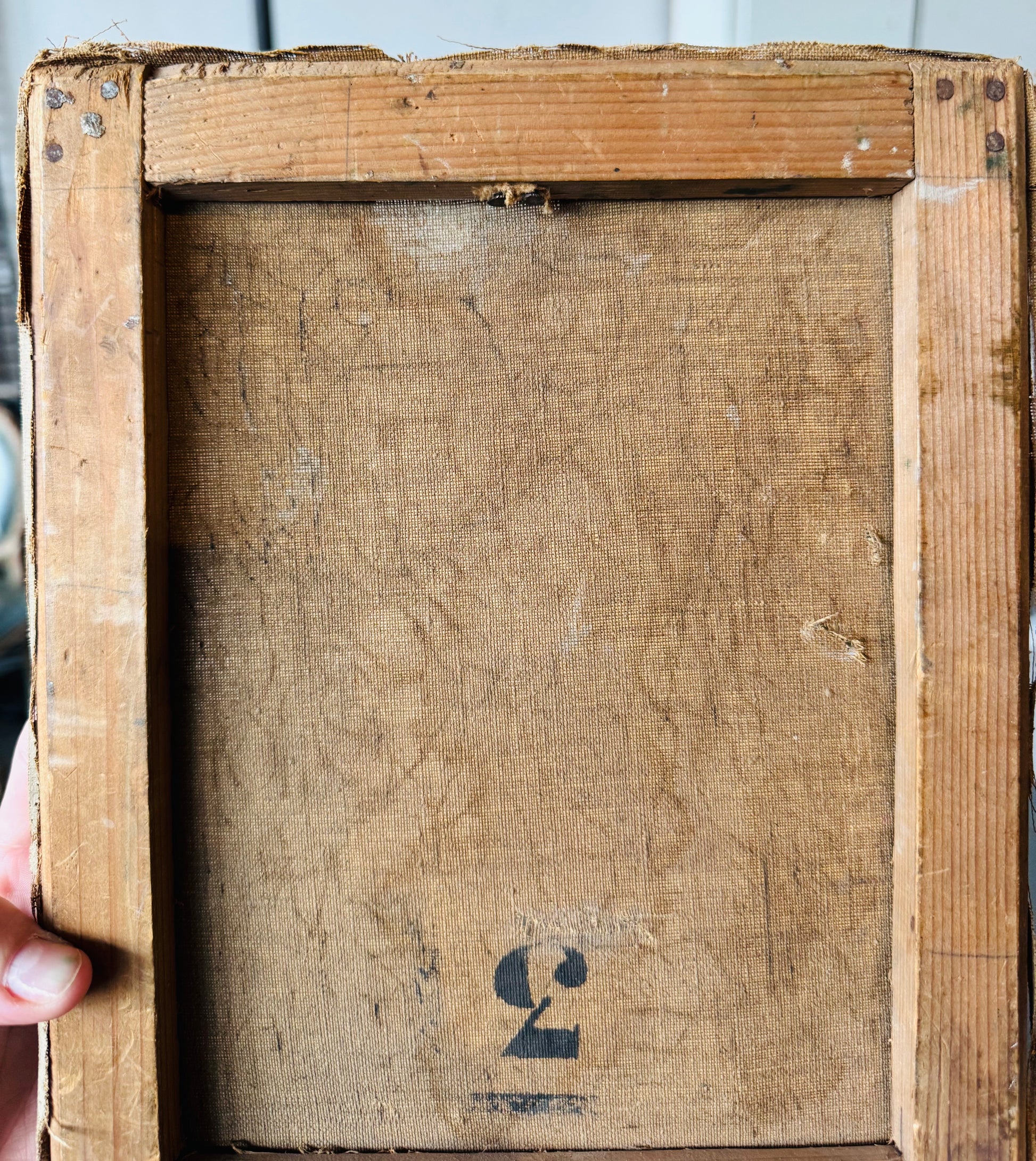 This piece displays significant surface wear, paint loss, frayed canvas edges, and timeworn texture, all contributing to its irresistible rustic character. The back reveals an early stretcher, nails, and an old stenciled marking—adding to its authenticity and history.