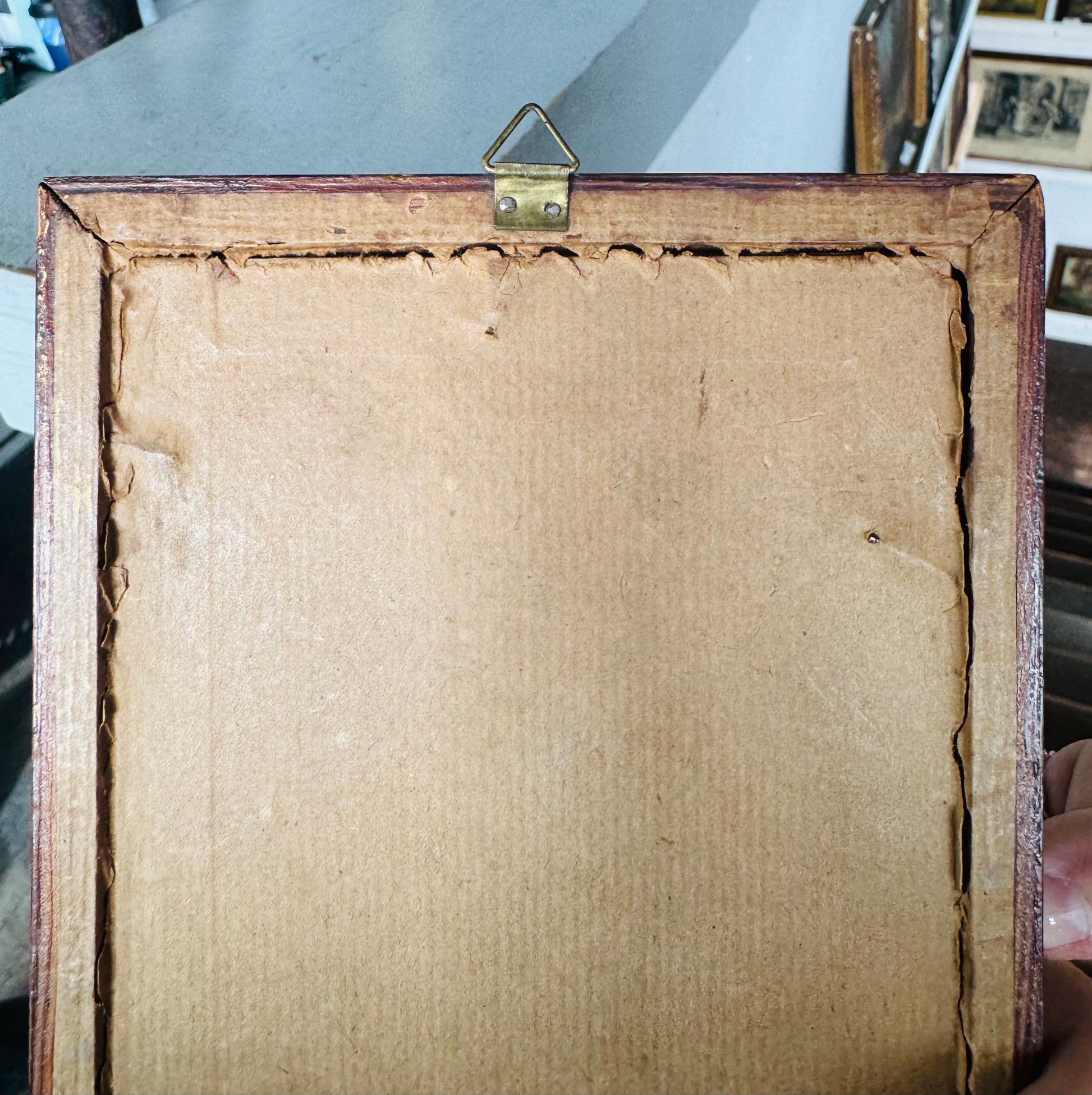 The artwork is housed in its original wood frame with a warm reddish-brown tone and simple, understated lines that let the image take center stage. The muted pastel colors, golden halo, and serene garden setting create a gentle, comforting presence perfect for sacred spaces or vintage-inspired interiors.