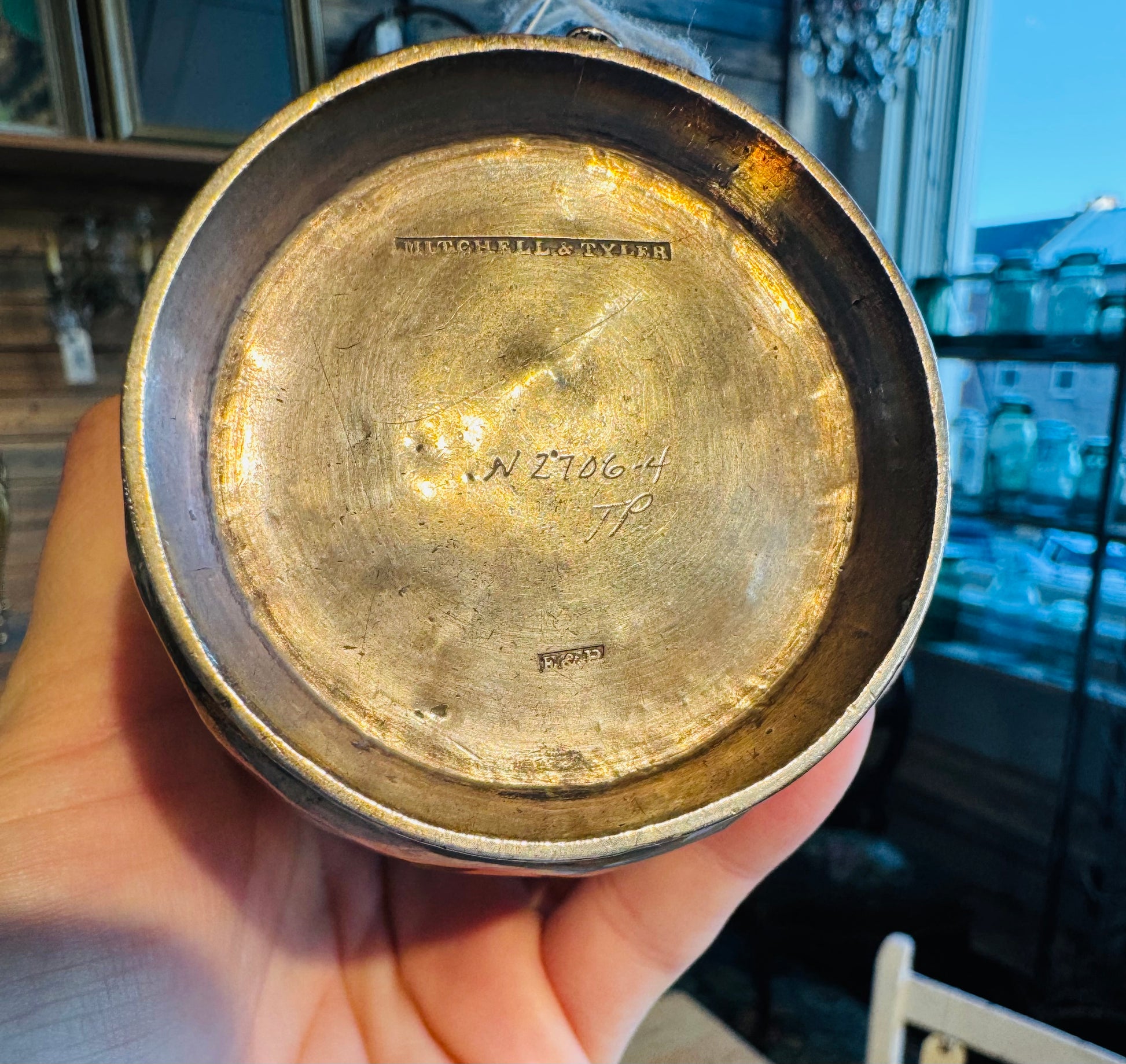 This piece is clearly marked “Mitchell & Tyler” on the base, a respected English maker, along with original production numbers. The front is engraved “Ellen” in graceful script, adding a lovely personal, heirloom-quality touch.