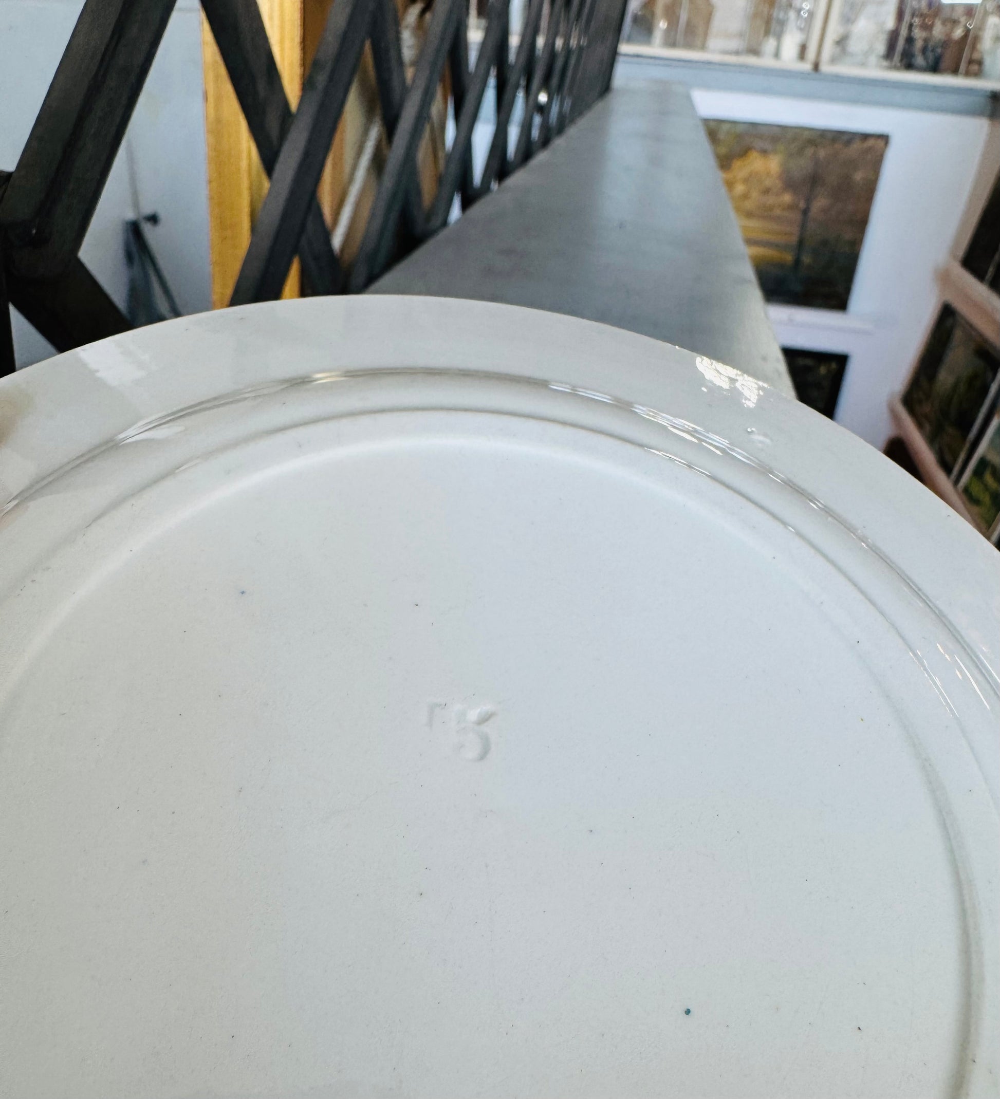 A beautiful late 19th century French advertising souvenir plate featuring a panoramic view of the Ville de Blois along the Loire River. Rich in historic detail, the plate is surrounded by ornate cartouches advertising merchants and boutiques of the era—from haberdashery and jewelers to milliners and fine tableware shops.