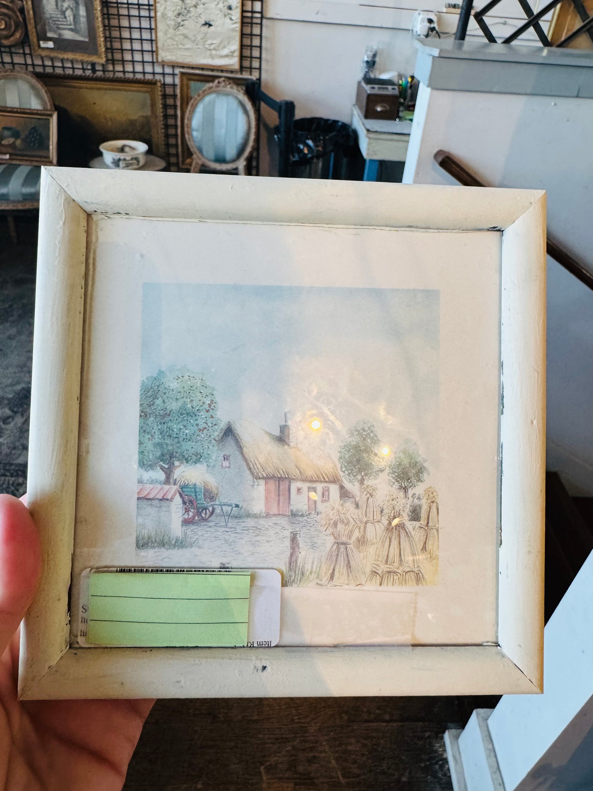 A charming vintage framed pastoral print depicting a quiet European countryside scene—complete with a thatched-roof cottage, haystacks, trees, and a horse-drawn cart. Soft, muted tones and delicate linework give this piece a calm, storybook quality that feels timeless and collected.