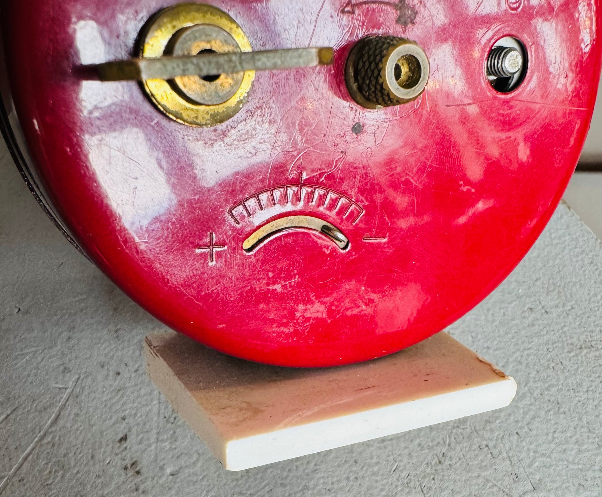 The back shows metal wind keys and adjustment levers along with the signature whimsical “sad face” tension indicator, a detail beloved by JAZ collectors. Surface wear, patina, and paint rubs add to its authentic vintage character.